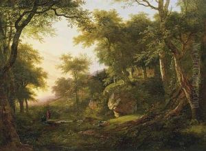 Wooded Landscape With Two Figures Beside A Stream