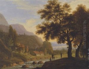 A Wooded River Landscape With Figures Fording A River
