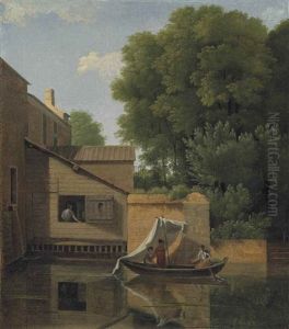 Paysage Avec Des Promeneurs Traversant Une Riviere