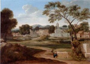 Villa Italienne Antique Pres D'un Lac Et Personnages Pres D'une Fontaine (pair)