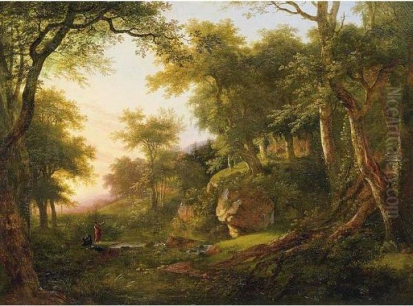 Wooded Landscape With Two Figures Beside A Stream