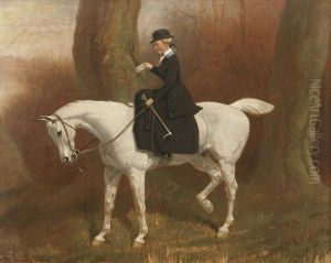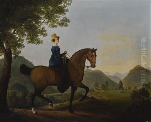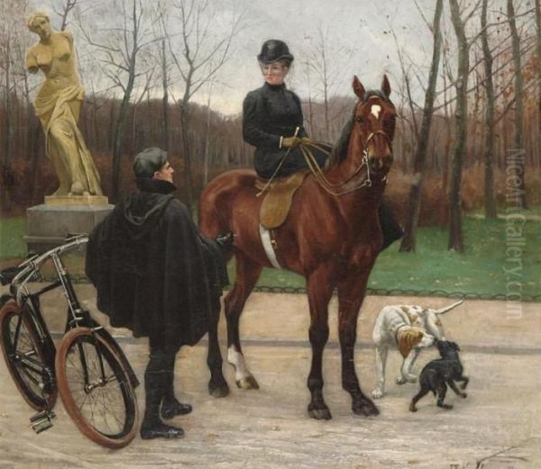 Romantic Scene In The Park With Lady On A Horse, Young Man And Two Dogs