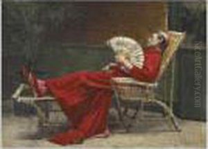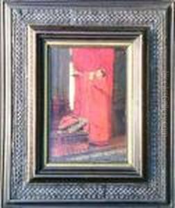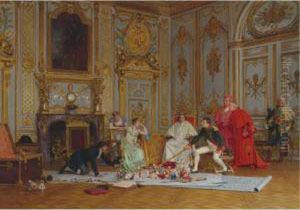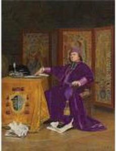 Kardinal An Einem Tischsitzend, Eine Schreibfeder Betrachtend, Auf Der Lehne Des Stuhlesein Kakadu.