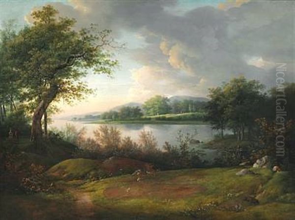 Et Landskab. I Baggrunden, Som Adskilles Fra Det Orige Landskab Ved En Soe, Sees Nogle Bakker. Paa Forgrunden Paa En Eng Staar En Hest (fjernet, Overmalet). Paa Den Venstre Side Af Landskabet Kommer En Bonde Gaaende Tiligemed En Malkepige