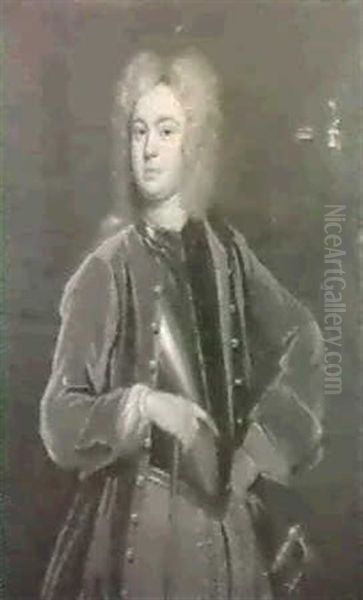 Portrait Of A Man, Standing Half Length, In A Full Bottomed Wig, Red Coat, Brown Breeches And Breastplate