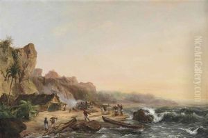 A Coastal Landscape With A Dutch Fishing Boat And Fishermen Drawing In Nets From A Rowing Boat