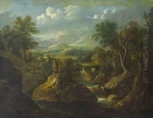 Mountainous River Landscape With Fishermen And Cattle Beneath Some Falls, A House Beyond