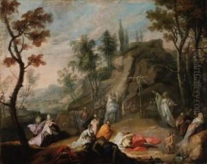 An Extensive Mountainous Landscape, With The Rest On The Flight To Egypt In The Foreground