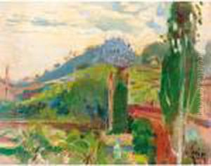Paisaje Enmarcado Por Grandes Arboles. Al Fondo, Una Montana (Landscape With Trees And Mountains In The Background)