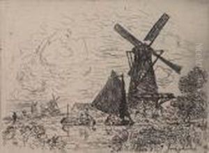 A Sailboat Moored On The Bank Of A Stream With A Windmill Beyond