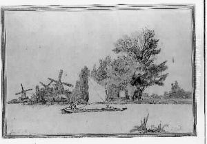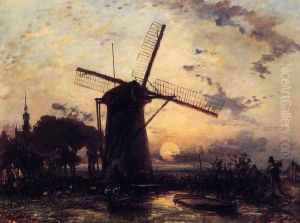 Boatman By A Windmill At Sundown
