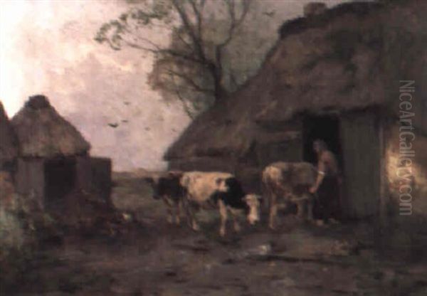 Herding Cattle Into A Barn Oil Painting by Johan Frederik Cornelis Scherrewitz