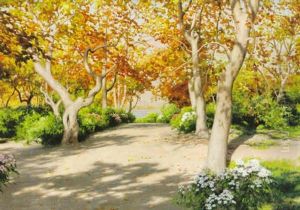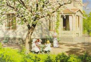 Parkmotiv Med Blommande Frukttrad Samt Lekande Smaflickor - Solig Sommardag