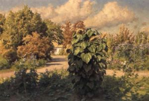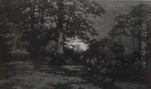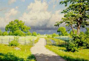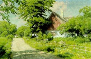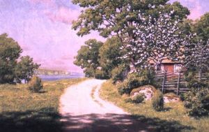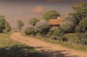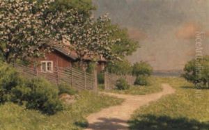 Sommarmotiv Med Blommande Frukttr,d Och R"d Stuga