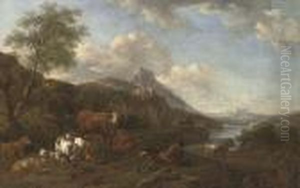 A River Landscape With A Drover At Rest With His Cattle