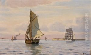 Seascape With Sailing Ships In The Evening Sun, In The Background Kronborg Castle
