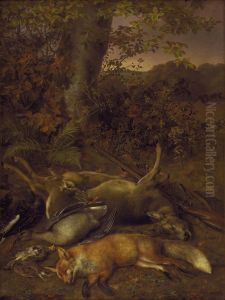 Thistle, Echinops, Myrtle in a glass Vase with Oranges, Blackberries and a Butterfly on a brown marble Ledge.