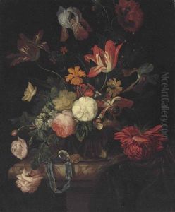 Thistle, Echinops, Myrtle In A Glass Vase With Oranges, Blackberries And A Butterfly On A Brown Marble Ledge