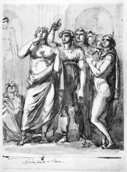 Bjornstal i Rom. Bjornstal och nagra andra man tecknade som antika figurer