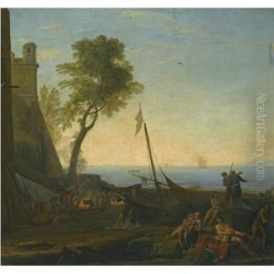 A Harbour With Figures On The Quayside In The Foreground