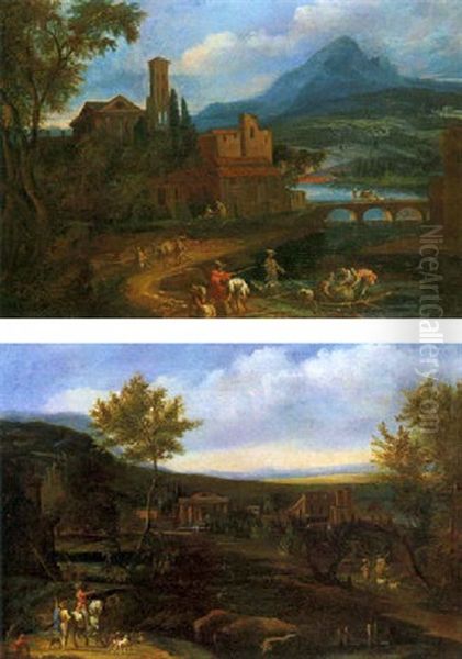 Paesaggio Fluviale Con Viandanti Ed Un Gruppo Di Casolari