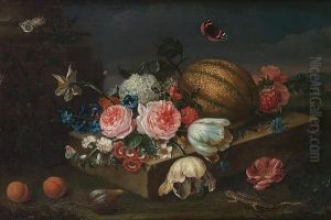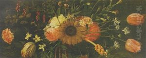 Still Life With Carnations, Roses, Hollyhocks And Other Flowers In A Sculpted Bronze Urn With Butterflies In An Alcove