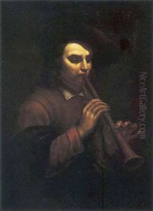 A Young Boy, In Profile, Playing A Pipe