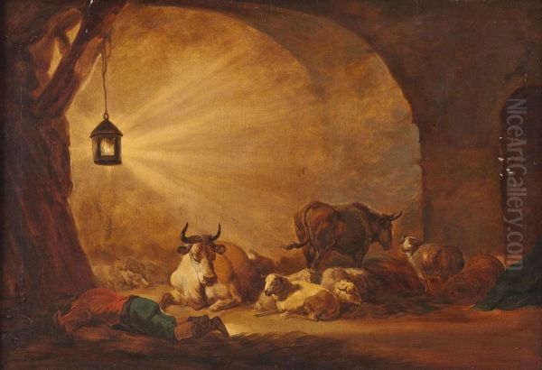 Schlafender Hirte Mit Schafen Und Kuhen Im Stall