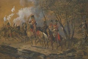 Reiterpatrouille Vor Einem Brennenden Dorf (+ Reiter Vor Dem Feind Einen Fluss Passierend; Pair)