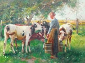 Magd Mit Kuhen Auf Der Weide