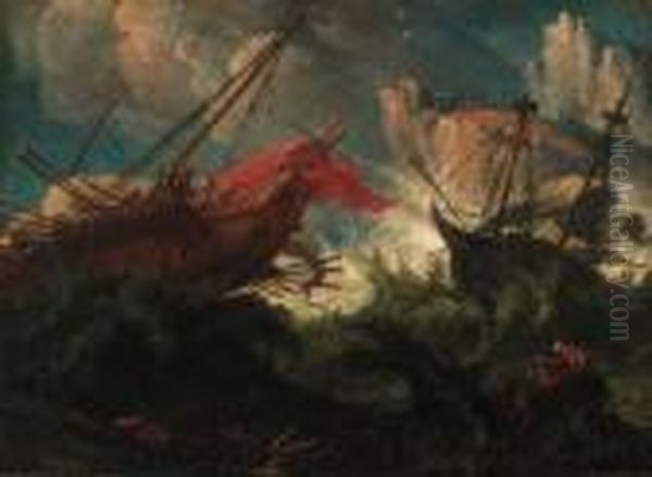 A Galley And A Man-'o-war In Stormy Seas Off A Rockycoastline