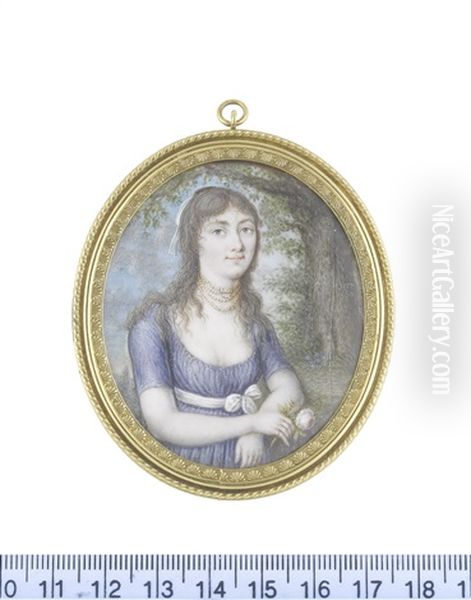A Lady, Standing In A Landscape, Holding A Rose, Wearing Blue Dress With White Sash To Her Waist Tied In A Ribbon Bow...