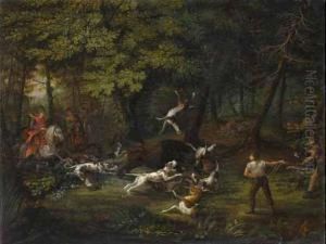 A Wooded Clearing With A Huntsman At Rest With His Hound And A Dead Hare, Woodcock And Other Birds