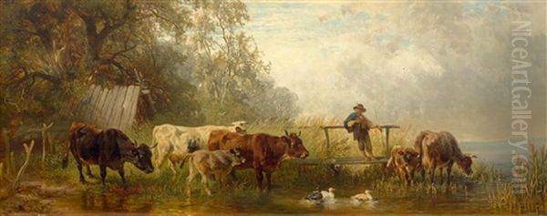Hirtenbub Am Steg Mit Kuhen Und Enten Im Wasser