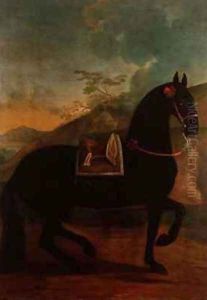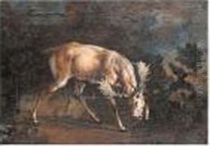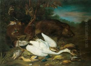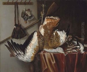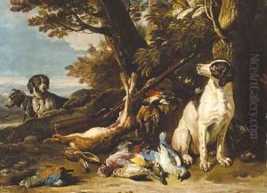 A Dead Hare And Finches With A Spaniel And Hunting Paraphernalia Beneath A Tree