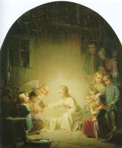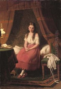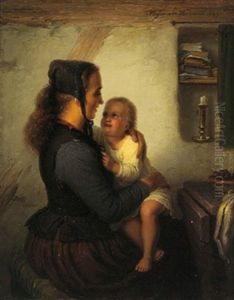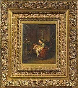 Stubeninterieur - Eine Mutter Wacht An Der Wiege Ihres Schlafenden Kindes