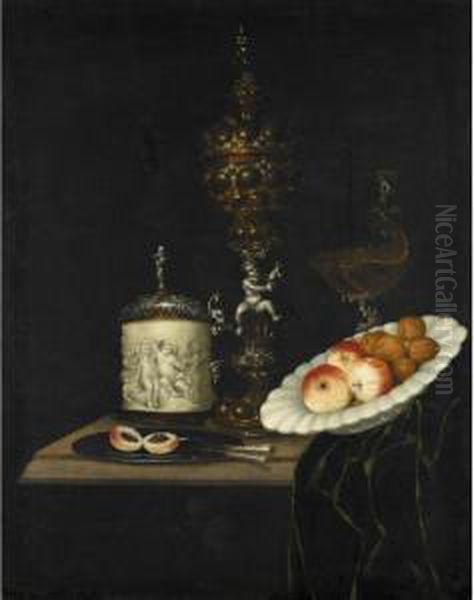 A Still Life Of Apples And Walnuts In A Ceramic Dish, An Elaborate Silver And Gilt Cup And Cover, A Silver And Gilt Nautilus Shell Tazza, A Silver Mounted Ivory Tankard, Knives And A Peach On A Salver, All Upon A Table Partly Draped With A Green C