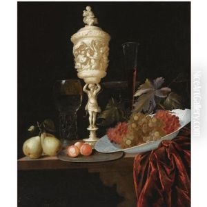 A Still Life With An Ivory Carved Cup And Cover, A Roemer, Pears, Prunes On A Pewter Plate, Grapes In A Porcelain Wan-li Bowl, A Flute-glass And A Tazza, All On A Wooden Ledge Draped With A Red Velvet Cloth