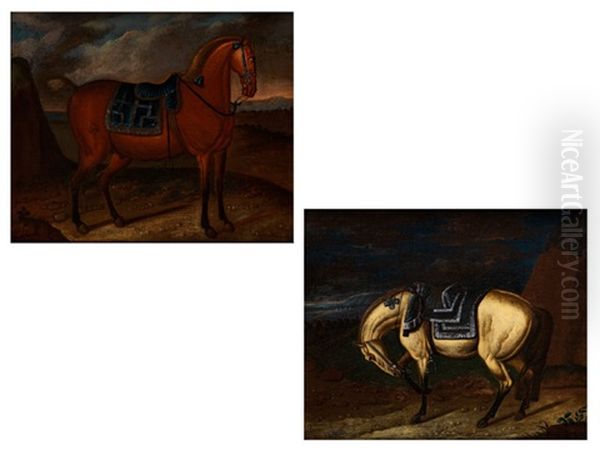Nach Rechts Stehender Fuchs In Landschaft Mit Sattel Und Dunkelblauer Satteldecke (+ Nach Links Stehender Schimmel Mit Gesenktem Kopf, Mit Blauer, Silber Gefranster Satteldecke; Pair)