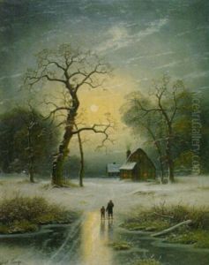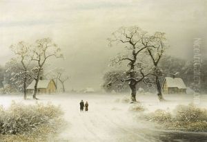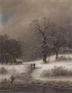 Winter Landscape With Couple Approaching Cottage