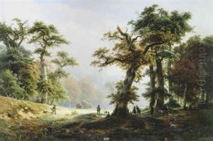 Bewaldete Landschaft Mit Einem Teich Und Figuren