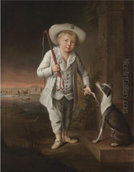 Portrait Of Christian Hohenzollern, Full Length, Wearing A White Costume And Hat, With His Pet Whippet By The River Oder, The Castle Of Schwedt Beyond