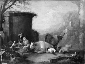 Cows, Sheep And A Goat With A Shepherdess And Her Child By Classical Ruins