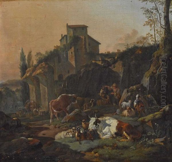 Abendlandschaft Mit Lagernden Rindern, Schafen Und Ziegen. Im Hintergrund Felsen Und Ruinen. Im Mittelgrund Eine Hirte, Der Einen Ziegenbock Bandigt