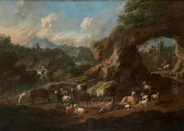 Berger Gardant Son Troupeau Pres D'une Arche De Pierre Au Bord D'une Cascade