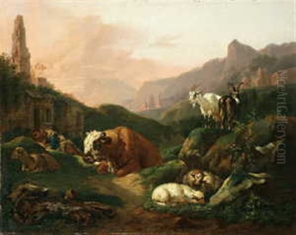 Sudliche Gebirgslandschaft Mit Viehherde Und Schlafendem Hirten