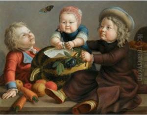 A Group Portrait Of The Artist's Three Sons, Seated On A Stone Ledge With Fruit