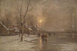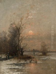 Abendliche Winterlandschaft Mit Heimkehrern Auf Einem Zugefrorenem Kanal