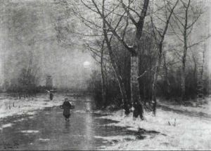 Fischerfrauen Auf Zugefrorenem Gew,sser, Winterabend