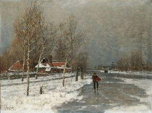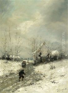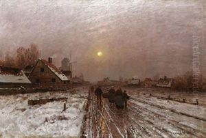 Abendliche Winterlandschaft Mit Heimkehrenden Bauern